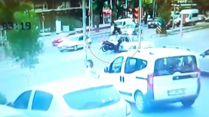 Görüntülerde süratle gelen motosiklet sürücüsünün önüne çıkan otomobile çarptığı, daha sonra takla atan sürücünün sert bir şekilde zemine düştüğü görüldü.