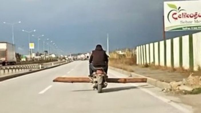 Plakası olmayan motosiklete yan olarak koyulan yaklaşık 4 metrelik tomrukla şehirler arası yola çıkan sürücü, hem kendi canını hem diğer araç sürücülerinin hayatını tehlikeye attı.