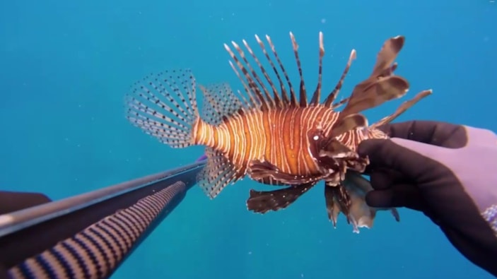 Antalya'nın Gazipaşa ilçesinde amatör balıkçılık ve serbest dalış sporu yapan Çağdaş Şaşmaz'ın, zıpkınla avladığı zehirli aslan balığının dikeni parmağına battı.
