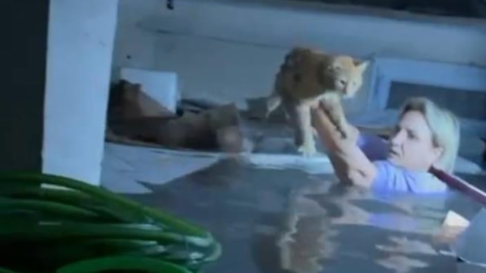 Sağanağın vurduğu kent sular altında kalırken AFAD gönüllüsü kadın, bodrum katında mahsur kalan kediyi kurtardı. O anlar cep telefonu kamerasına anbean yansıdı.