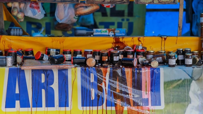 Yaşanan olayda bazı araçların camları kırıldı, tezgahtaki ürünler zarar gördü.