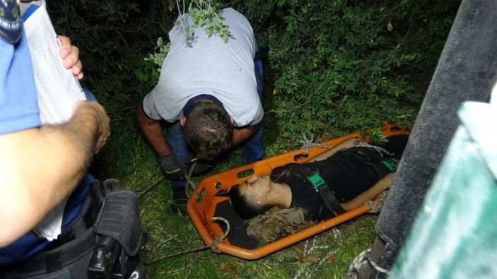 Halat ve merdiven yardımıyla genci kurtarmak için 15 metre ormanlık alandan aşağı inen itfaiye ekipleri genci sedyeye bağladı.