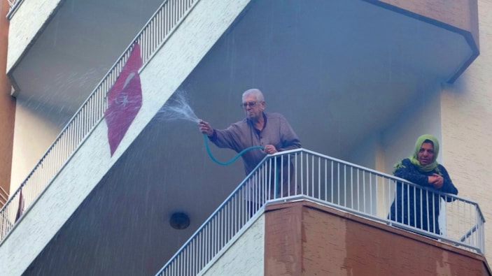 Muratpaşa ilçesinde seyir halindeki bir kamyonetin kasasında çıkan yangına vatandaşların balkondan hortumla, damacana, kova ve yangın tüpü ile müdahale ettiği anlar kameraya yansıdı.