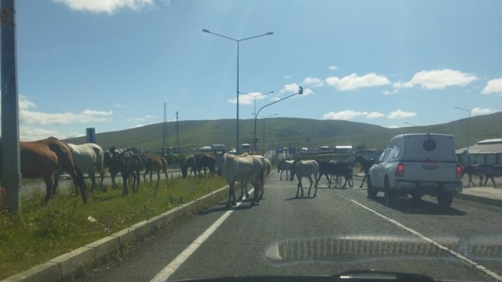 Ardahan’da anayola sık sık çıkan başıboş atlar, trafik kazalarına davetiye çıkartıyor. Başıboş dolaşan atların karayolunda ilerlediği ve sürücülerin çarpmamak için hızlarını düşürdüğü anlar, cep telefonu kamerasına yansıdı.
