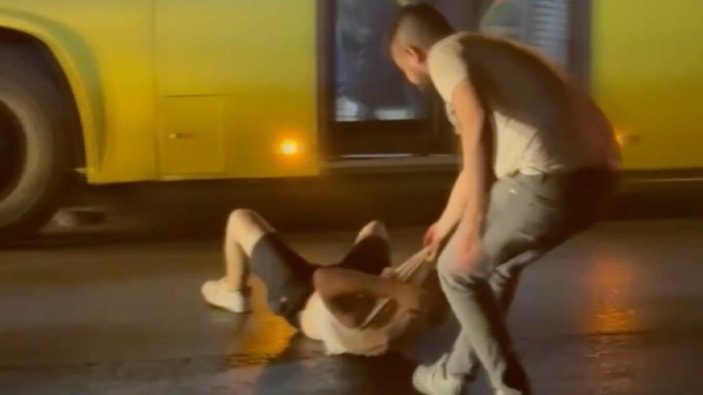 Şahıslardan birini yerde yatan şahsı sürükledi. Daha sonra araçlarına tekrar binen iki şahıs, araç içerisinde de kavga etmeye devam etti.