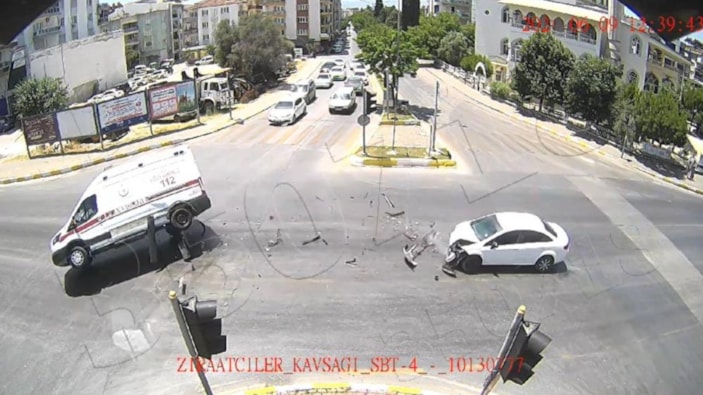 Efeler ilçesinde hasta taşıyan bir ambulansın kavşakta otomobille çarpışması sonucu devrilmesine ait Kent Güvenlik Yönetim Sistemi (KGYS) görüntüleri ortaya çıktı.