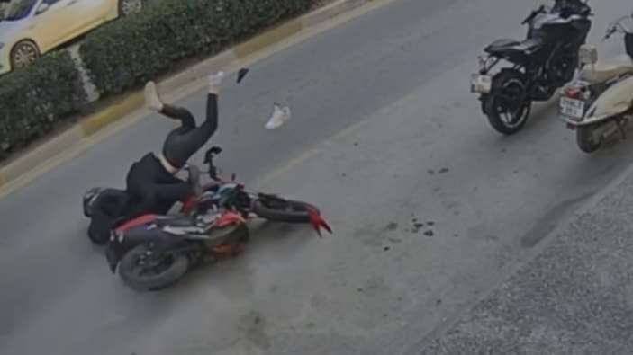 Efeler ilçesinde refüjden yolun karşısına geçmeye çalışan genç kıza motosiklet çarptı. O anlar güvenlik kamerasına yansıdı.