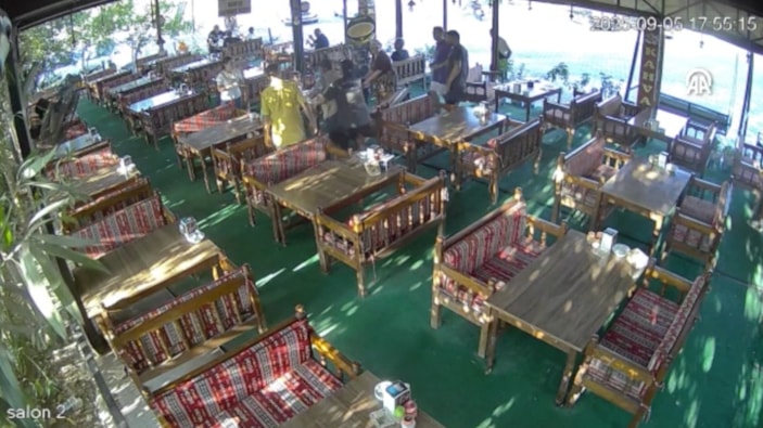 Görüntülerde, bir masada ailesiyle oturan yaşlı adamın, boğazına kaçan zeytin çekirdeği nedeniyle nefes alamadığı, bu sırada yanındaki kadının sırtına vurduğu görülüyor.