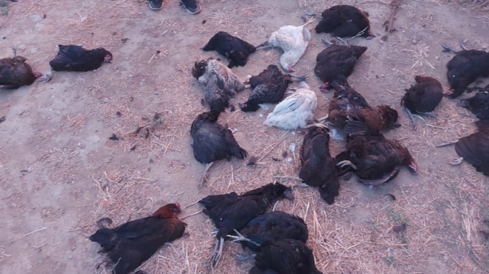 35 tavuğundan 25’inin yerde telef olduğunu gören Ocakoğlu, olay yerinden kaçan iki sokak köpeğini fark ettiğini belirtti.