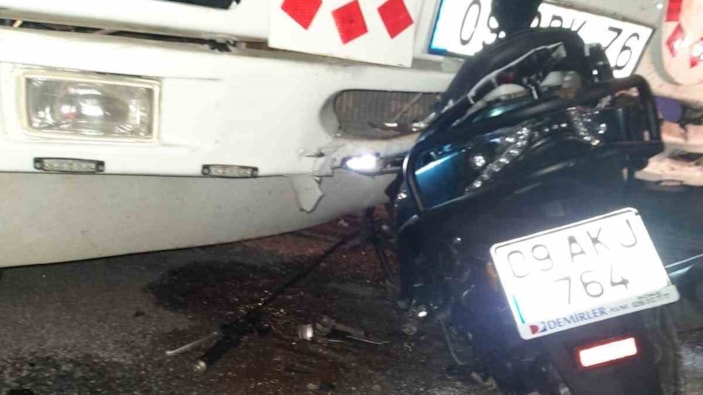 Aydın'da virajı alamayan motosiklet, kamyonete saplandı