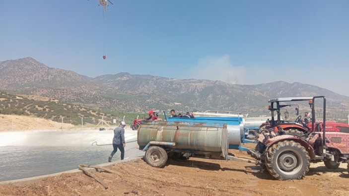 Arazi şartlarının sarp ve vadilerden oluşması sebebiyle zaman zaman ekiplerin alevlere karadan müdahalesi zor olurken, yangın söndürme helikopterlerinin su ikmali yaptığı yangın havuzlarının dolu kalması için Buharkentli vatandaşlar da, traktörlerle havuza su taşıyor.