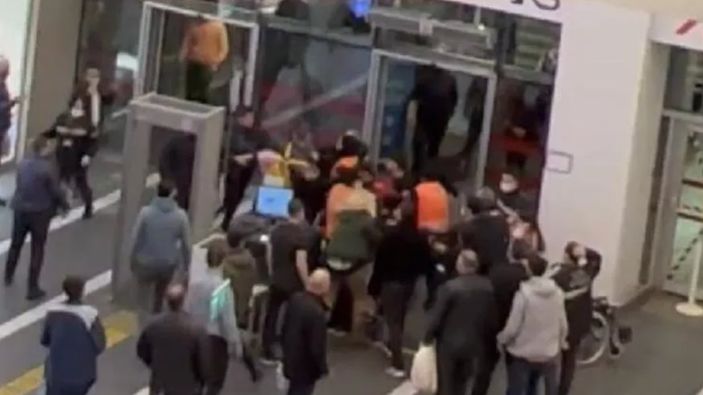Taraflar tekme ve yumruklarla birbirine girerken, kavgaya güvenlik görevlileri ve diğer müşteriler müdahale etti. Yaşananlar ise çevredekiler tarafından cep telefonu kamerasıyla kayda alındı.