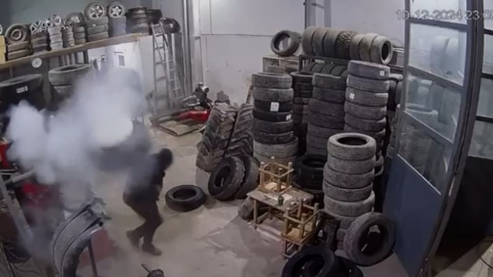 Görüntülerde, lastiği şişirmeye çalışan çalışanların bir anda yaşanan patlama karşısında hızla geri çekildikleri görülüyor.