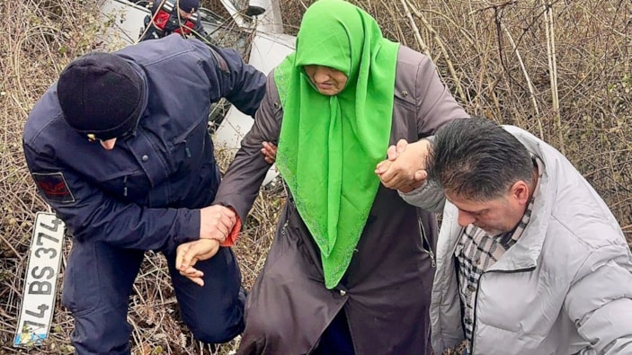 Çalılık alana devrilen otomobilde bulunan biri kadın 2 kişi, olay yerine gelen jandarma ekipleri tarafından sıkıştıkları araçtan çıkarıldı.