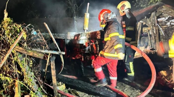 Düşen yıldırımla birlikte garajda bulunan traktör ve kamyonet yanmaya başladı.