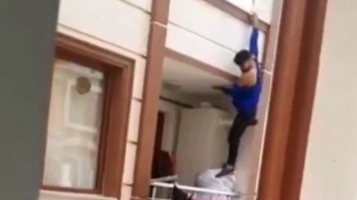 Evlenmek istediği genç kızın evini basan şahıs, yakalanacağını anlayınca hayatını riske atıp, balkondan alt katın balkonuna sarktı. Yaşanan o tehlikeli kaçış anı cep telefonu kamerasına yansıdı.