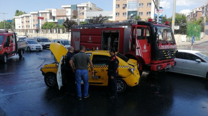 Siren çalarak ilerleyen itfaiye aracını görünce panikleyen taksi şoförü ani fren yaptı. İtfaiye aracı, taksiye arkadan çarptı.