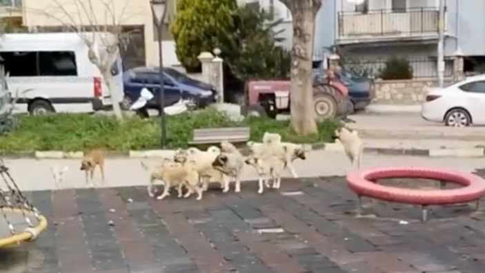 Başıboş köpek sürüsü korku saçtı: Anne, çocuklarıyla birlikte parka sığındı