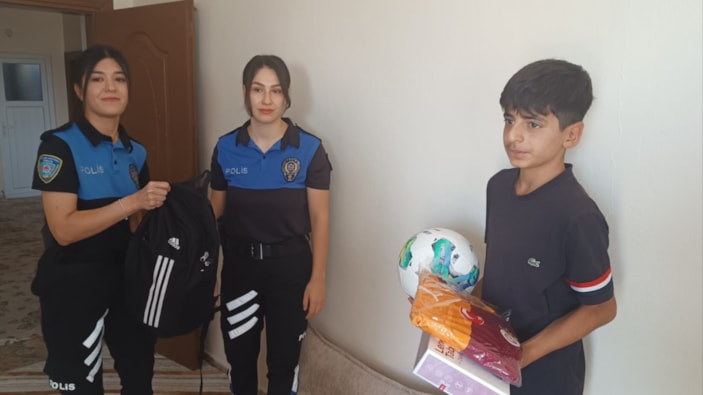 Fatih Mahallesi'ndeki evlerinde ziyaret edilen Ömer'e, gösterdiği örnek davranış nedeniyle kırtasiye malzemeleri, top ve tablet hediye edildi.