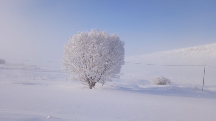Bayburt'un Demirözü ilçesinde dondurucu soğukların etkisiyle ağaçların üzeri kırağı ile beyaza büründü.