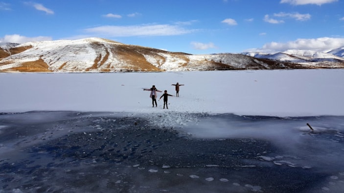 İki dağ arasında gökyüzündeki bulutların buza yansıdığı gölün manzarası kartpostallık görsel oluşturdu. Çocuklar buz tutan göl üzerinde yürüyüş yaparak eğlenceli anlar yaşadı.