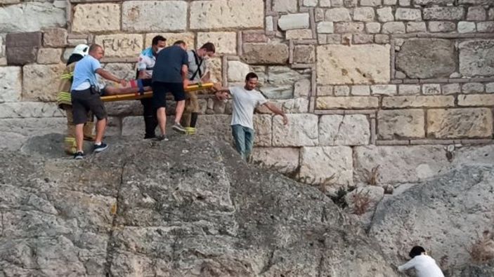 Başından ve bacaklarından aldığı darbe ile yaralanan kişi, etrafı deniz suyu ile çevrili kayanın üzerinde mahsur kaldı.
