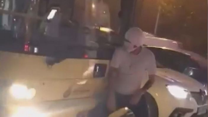Omzunu otobüsün ön kısmına dayayan şahıs, otobüsü durdurmaya çalıştı. Sürücüye “İn,kapıyı aç, aşağıda ineceğim.” diyen şahıs, bir yandan da otobüsün camını yumrukladı.