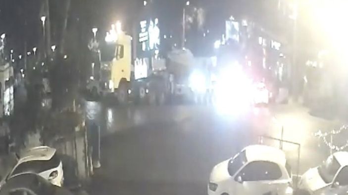 Görüntülerde, yukarıya çıkmak için manevra yapmaya çalışan tırın üzerindeki vincin patinaj çektiği, sürücünün ani fren yapmasıyla vincin devrildiği anlar yer aldı.