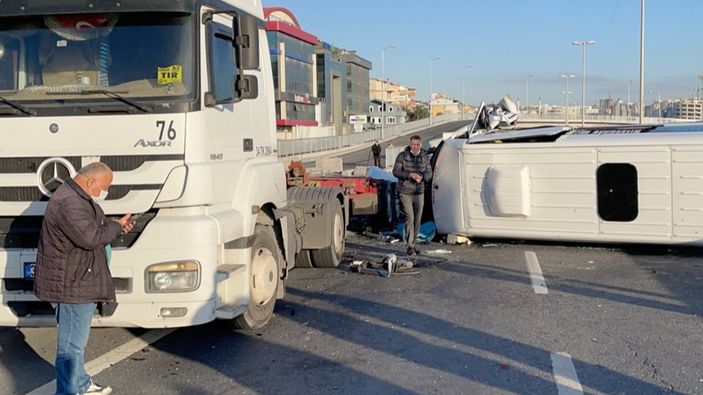 İstanbul Beylikdüzü'nde Yakuplu Liman Caddesi Ambarlı Limanı istikametinde ilerleyen 34 LAG 773 plakalı işçi minibüsü, sürücüsünün direksiyon hakimiyetini kaybetmesi üzerine yolda park halinde duran tıra çarpıp devrildi.