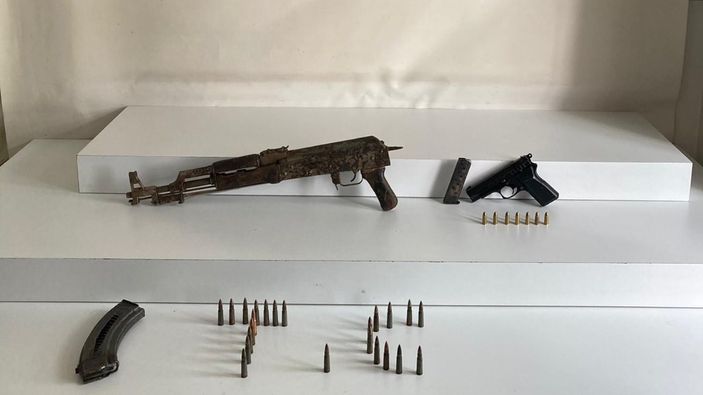 Yapılan aramalarda 1 adet AK-47 model uzun namlulu Kaleşnikof marka silah, 1 adet ruhsatsız tabanca ve 7 adet 9 mm fişek ele geçirildi.