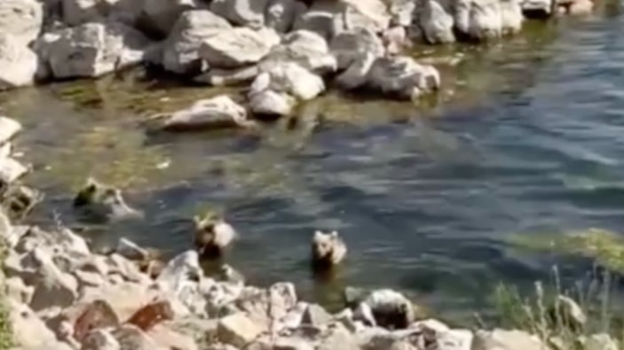 2 bin 948 rakımlı Nemrut Kalderası'nda sıcaktan bunalan yavru boz ayılar, krater gölünde serinledi. Ayıların o anları kameralara yansıdı.