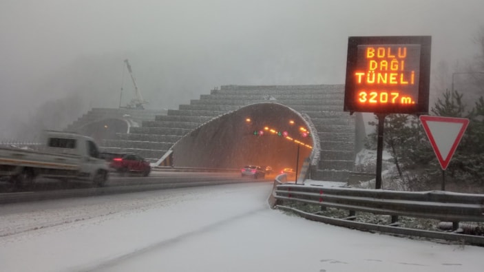 Ankara ile İstanbul arasındaki en önemli geçiş güzergahı olan Bolu Dağı geçişinde sabah saatlerinden itibaren etkili olan yağmur, yerini öğleden sonra yoğun kar yağışına bıraktı.
