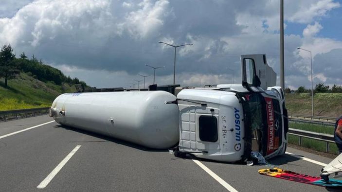 Otoyol üzerinde LPG yüklü tanker yan yattı.