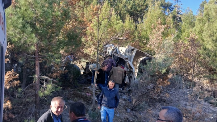 Çam ağaçlarını devirerek yaklaşık 40 metre yükseklikteki uçurumdan aşağı düşüp devrilen kamyon hurdaya dönerken sürücü ise araç içerisinde sıkışarak ağır yaralandı.