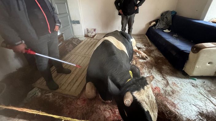 Kesime götürülmek için ahırdan çıkarılan tosun, kamyona yükleneceği sırada ürkerek evin camını kırıp salona girdi.