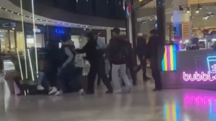 Nilüfer ilçesinde bir alışveriş merkezinde iki grup arasında çıkan tekmeli yumruklu kavga cep telefonuyla görüntülendi.