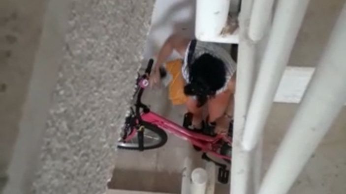 Ayakkabıların ardından apartman içindeki bisiklete yönelen kadın, binadaki bir kişi tarafında cep telefonu kamerası ile görüntülendi.