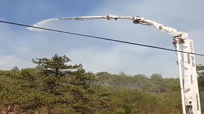 Kütahya’nın Tavşanlı ilçesinde oturan ve Bursa’da hazır beton firmasında çalışan Ali Yalçın ve arkadaşları, Harmancık ilçesinde çıkan orman yangınının ardından çalıştıkları firmadan beton mikseri ile beton pompası aldı.