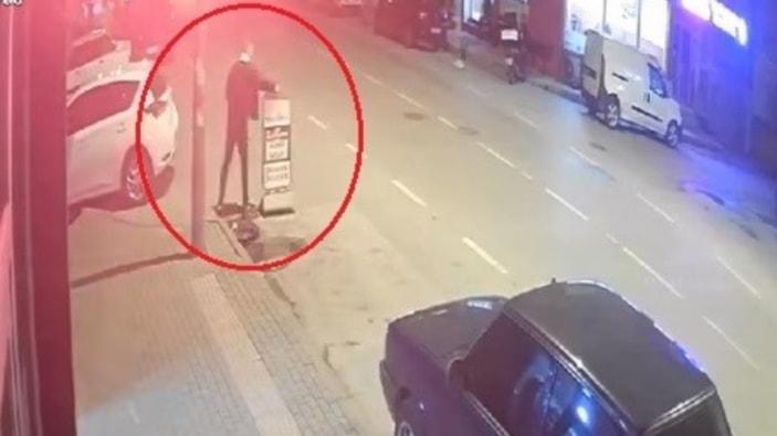 Bursa'da bir şahsın yoldaki reklam tabelasını alarak bir iş yerinin camların kırdığı anlar güvenlik kamerasına saniye saniye yansıdı.