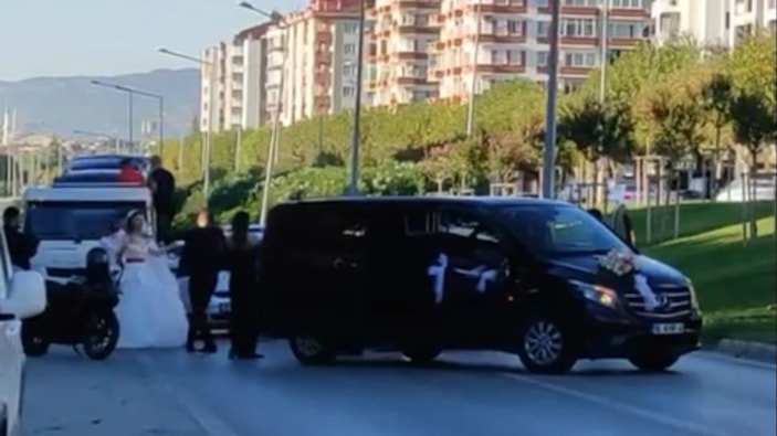 Nilüfer ilçesinde yolu kapatarak trafiği kesen düğün konvoyu trafiğe neden oldu. Eğlencelerinden taviz vermeyen gelin ve damat ise kameraya anbean yansıdı.