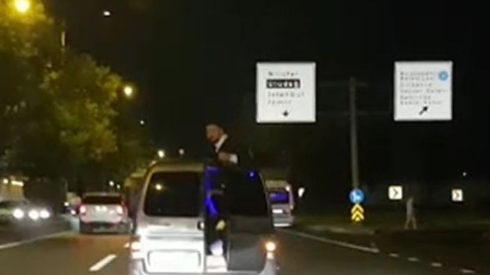 Bursa'nın en işlek caddelerinden biri olan Ankara Yolu Caddesi'nde seyir halinde olan düğün konvoyundaki vatandaşlar, araçların kapı ve camlarından dışarıya çıktı.