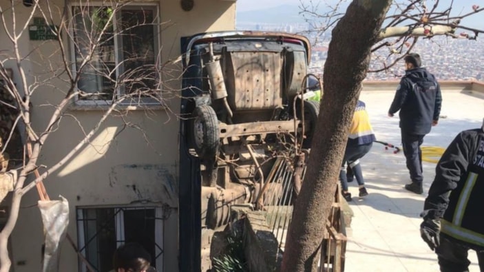 Bursa'da direksiyon hakimiyetini kaybeden yaşlı adam, otomobiliyle evin bahçesine uçtu. Dik kalan otomobilde sıkışan adam, itfaiye ekiplerince sıkıştığı yerden çıkarıldı.