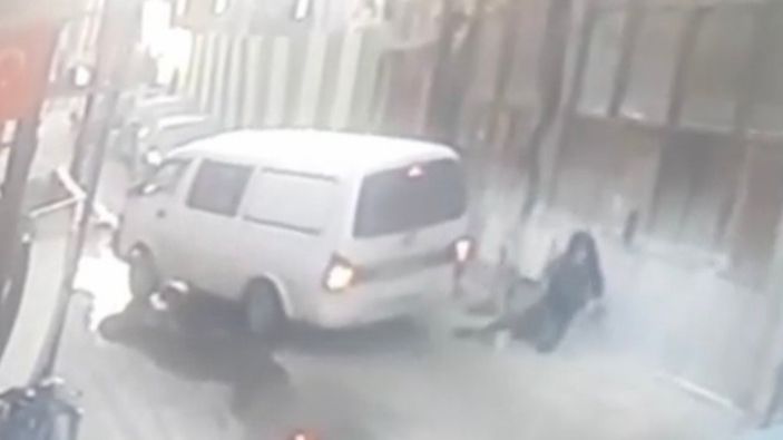 Her şeyden habersiz şekilde sokakta bekleyen adama, geri manevra yapan bir minibüs çarptı. Yere düşen genç, ayağa kalktı. O anlar bir iş yerinin güvenlik kamerasına yansıdı.