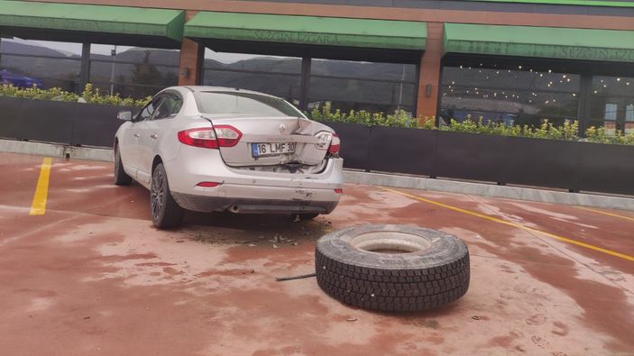 Bursa'da hareket halindeki kamyonun arka tekerlerinden biri kopup, hızla ilerleyerek bir restoranın önünde bulunan park halindeki otomobile çarptı.
