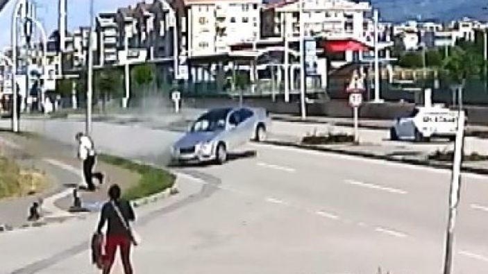 Polis ekipleri, olay yerinde incelemelerde bulundu. Kazanın olduğu esnada kaldırımda yürüyen bir kişinin lüks otomobilin altında kalmaktan saniyelerle kurtulduğu anlar kameraya yansıdı.