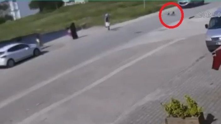 Tam bu sırada yoldan geçen bir araç, küçük çocuğa çarpmak üzereyken çocuğun ayağı takılıp yere yuvarlandı.
