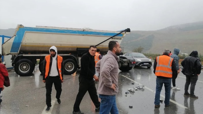 Dubalar ile bölünen otoyolda aniden şerit değiştiren hafriyat kamyonuna, yolcu otobüsü çarptı. 3 yolcunun hafif yaralandığı kaza, araç içi kamerasına yansıdı.