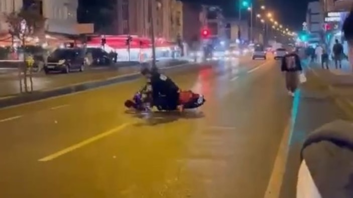 Akşam saatlerinde trafiğin aktığı caddede motosikletiyle drift atmak isteyen bir sürücü yan yattı. 'Kazanın geliyorum' dediği anlar kameraya yansıdı.