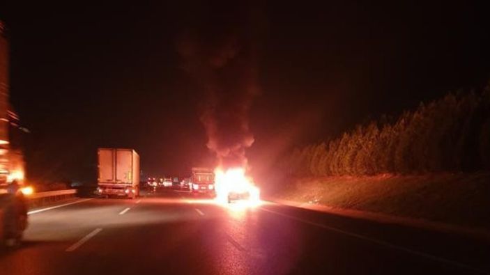 İzmir-Bursa otoyolunun İzmir istikametinde bir otomobil otoyol üzerinde seyir halindeyken lastikleri bir anda alev aldı.