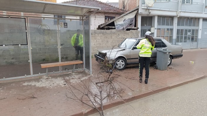 İnegöl ilçesinde dur ihtarı veren polis ekibinden kaçan 20 yaşındaki ehliyetsiz otomobil sürücüsü, otobüs durağına çarpıp kaza yapınca gözaltına alındı.